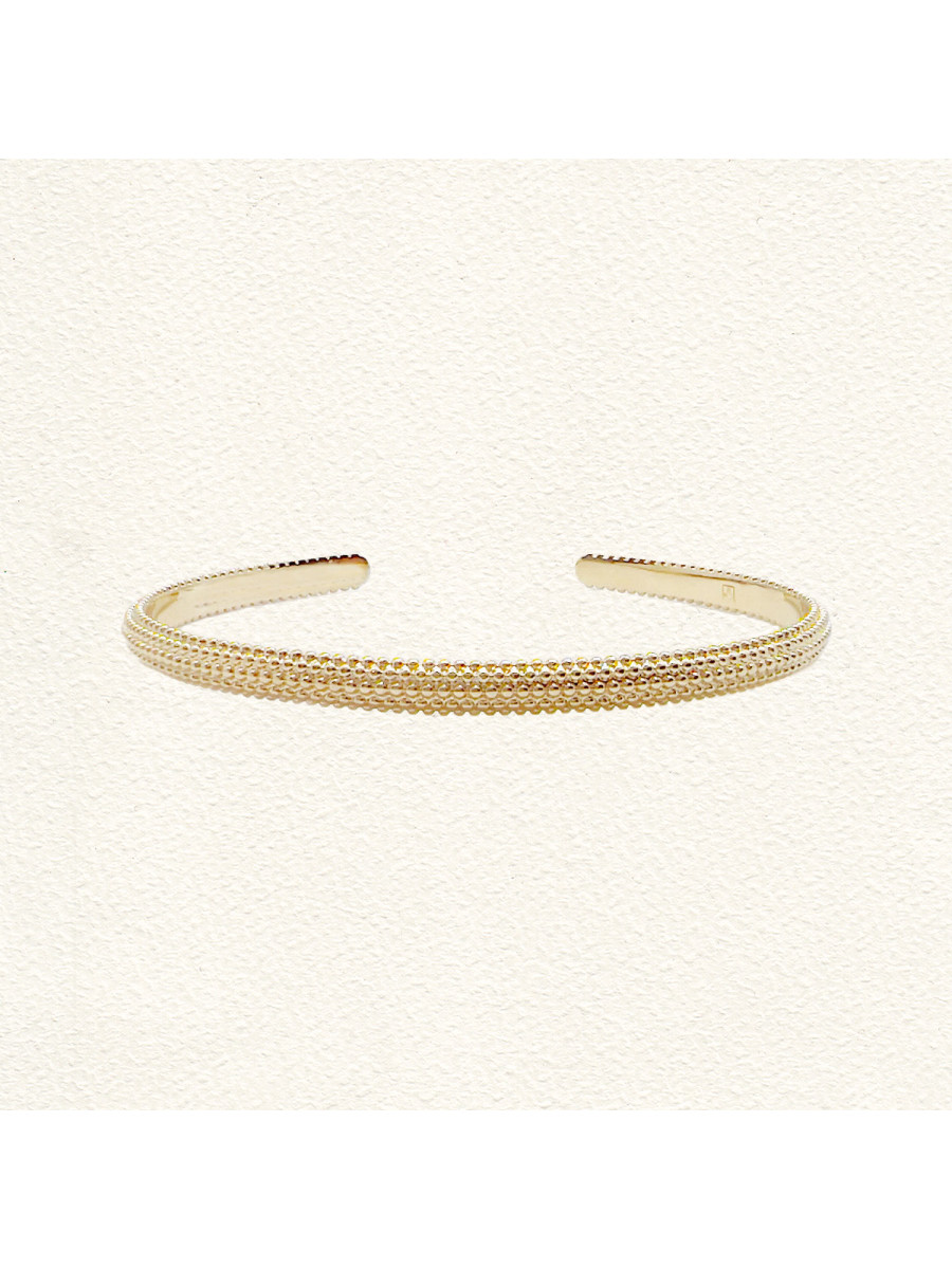 Un sublime jonc alliant robustesse et finesse, il est légèrement bombé ce qui lui donne beaucoup d'éclat et ls petits picots si denses et si bien alignés en font un modèle clasqie mai résolument moderne. A adopter, vous ne vous en lasserez jamais !
