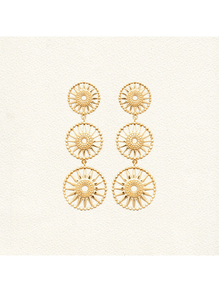 Élégantes et pleines de caractère, ces boucles d’oreilles pendantes en plaqué or se composent de trois cercles évidés disposés en cascade. Chaque cercle est orné de motifs délicats, inspirés d’un style légèrement antique, qui ajoutent relief et raffinement à l’ensemble. Légères et gracieuses, elles dansent au rythme de vos mouvements et apportent une touche sophistiquée à n’importe quelle tenue, du quotidien et aux occasions spéciales.