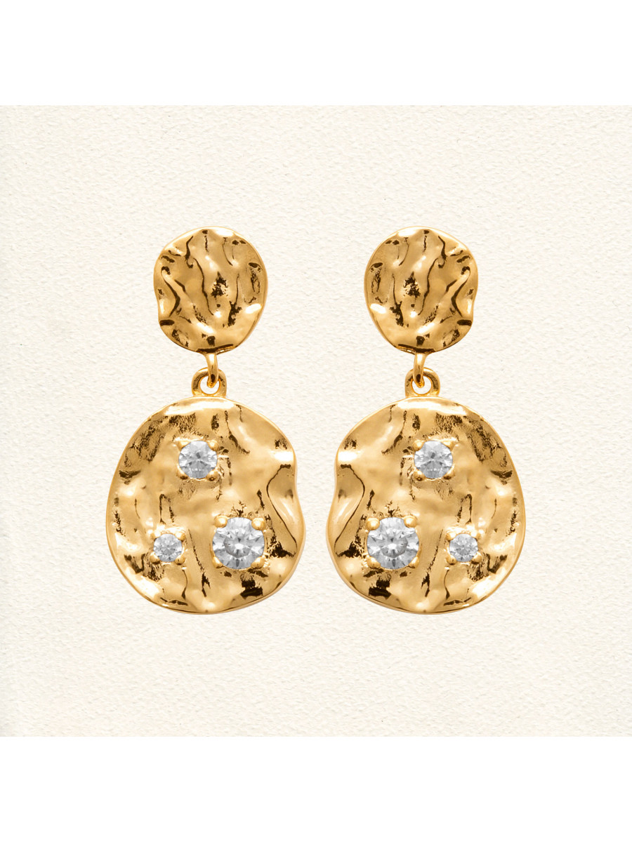Apportez une touche d'élégance audacieuse à votre look avec les boucles d’oreilles Domitille en plaqué or. Leur design texturé et organique évoque un effet martelé artisanal, offrant un style à la fois brut et raffiné. Chaque pièce est délicatement sertie de trois oxydes de zirconium scintillants, qui captent magnifiquement la lumière pour un éclat subtil. Légères et confortables, elles sont idéales pour sublimer une tenue de jour comme de soirée.