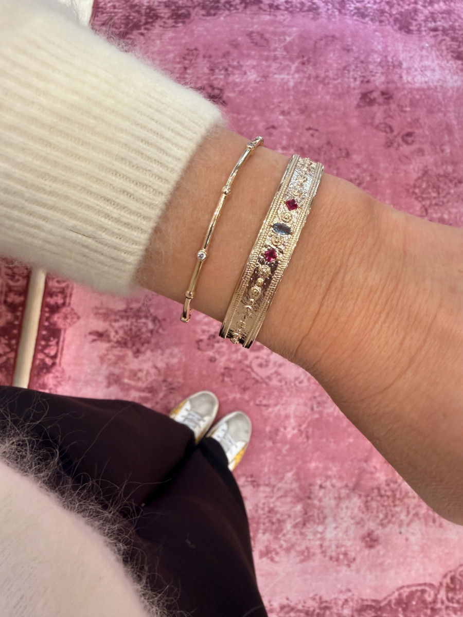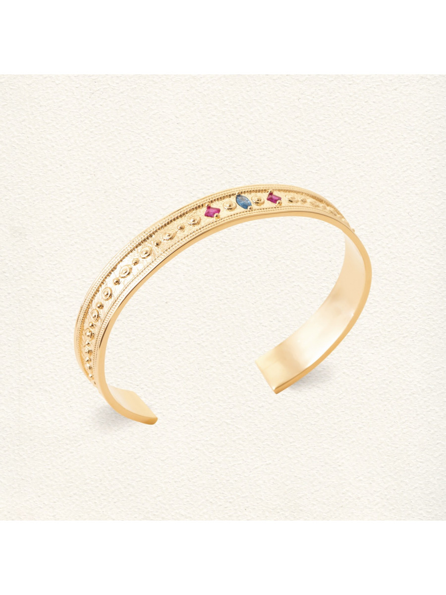 Le jonc Zina est à la fois raffiné et contemporain.Il est orné d'oxydes de zirconium qui lui apportent une touche d'éclat et de couleur. Ce bracelet, à la fois délicat et audacieux, s’adapte à toutes les occasions, du quotidien comme aux moments plus sophistiqués. Son ouverture permet une légère ajustabilité, offrant ainsi un confort optimal. Une pièce incontournable pour celles qui recherchent un bijou à la fois chic et intemporel.