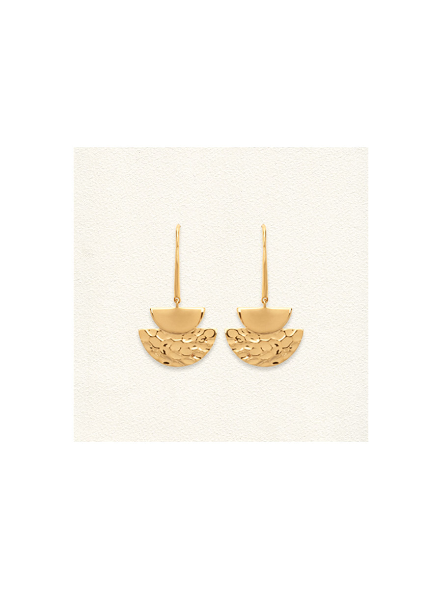 Les boucles d'oreilles Malia de Matsai Mara, en plaqué or français recyclé, sont des pendantes élégantes composées d'une barre fine qui soutient deux demi-cercles : l'un lisse et plus petit, l'autre martelé. Un design moderne et raffiné qui apporte une touche de sophistication à votre look.