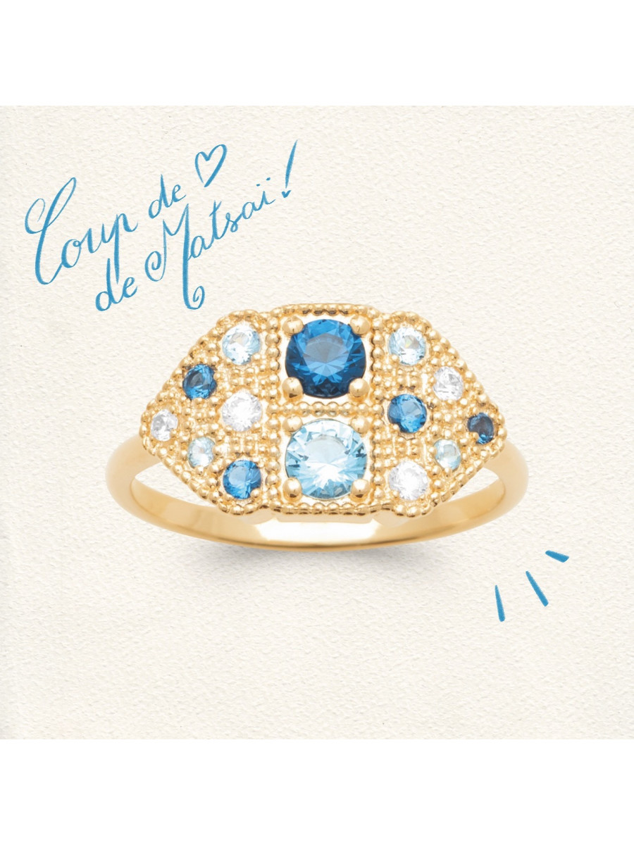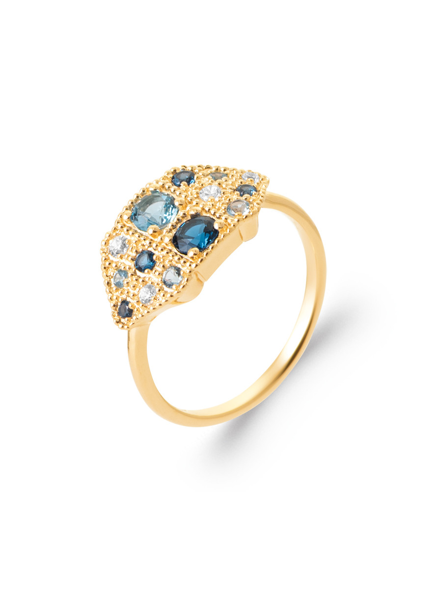 Cette élégante bague en plaqué or séduit par son design raffiné et ses pierres précieuses scintillantes. Elle est ornée de multiples oxydes de zirconium, dont des pierres bleu profond et clair, apportant à l'ensemble un éclat subtil et moderne. La forme arrondie du design et le montage délicat des pierres créent un effet visuel harmonieux, parfait pour compléter vos tenues avec une touche sophistiquée. Que ce soit pour une occasion spéciale ou un usage quotidien, cette bague ajoutera une note de luxe à votre collection de bijoux.